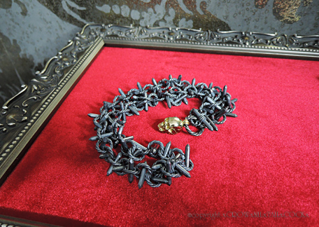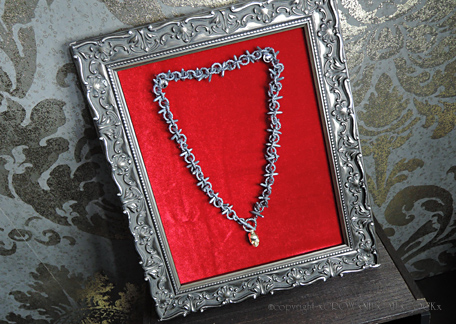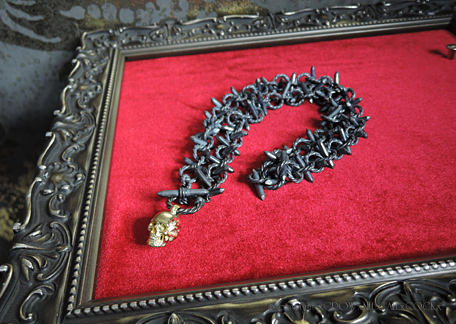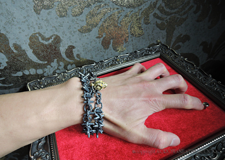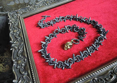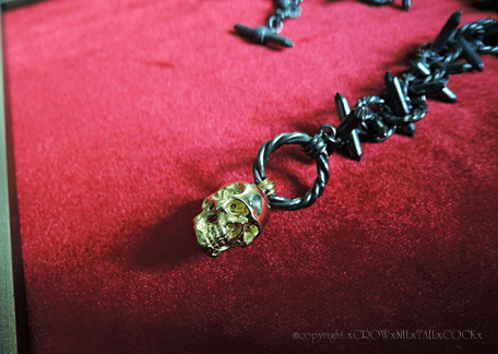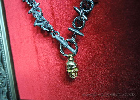 イエス・キリストの痛みを体感するためのネックレス有刺鉄線を思わせる刺々しいデザインの重厚なチェーンと、僅か1cm×1.7cmの領域にリアリティの限りを込めた黄金の頭蓋骨トップで構成された、ゴールド&シルバーネックレス。 まるで触れられることを拒むチェーンソーのような攻撃性が窺えるチェーン部分は、全表面に燻し処理を施したシルバー925で生成されており、茨の棘をモチーフにデザイン展開された環のパーツを一つ一つろう付け(溶接)して繋ぎ合わせることで、チェーン全体が荊冠のようなシルエットを形成している。 そして、印象的に輝くゴールドのスカルは、K18(18金)をマテリアルとしており、実に15グラムものゴールドが精巧な頭蓋骨造形の主として収められている。 ※チェーンを二重にしてブレスレットとして着用することも可能です。 |
