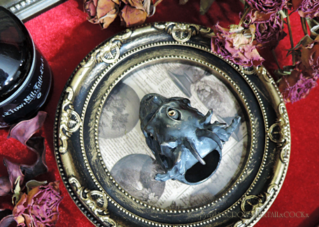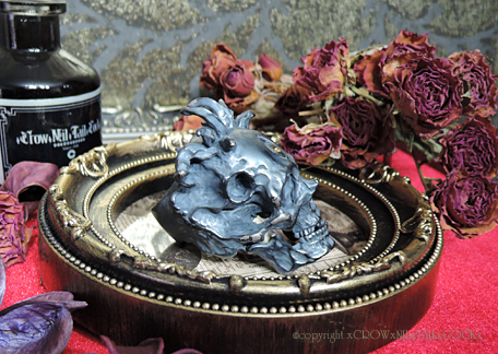 超重量級の頭蓋骨に山羊の頭骨を融合させた下顎可動式のスカルリング精細に造形されたシルバー製(Silver925)のスカルの両側面に山羊の頭骨を融合させ、頭頂部には歪に放射する8本の角をあしらったスカルリング。 約173グラムという指輪としてはあるまじき総重量を誇っており、額に埋め込まれた18金製のサードアイや造形全体の有機的な不気味さも相まって、人智を超えた悪魔的な呪物のようにも捉えられる作品となっている。 また、下顎にギミックを施すことによって開口可能な仕様となっており、単に着用したり鑑賞するだけでは得られない欲求を充足させることができる。 |