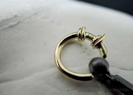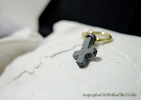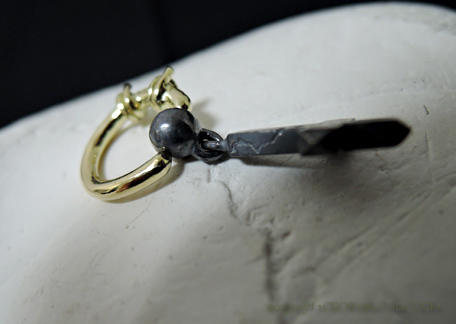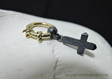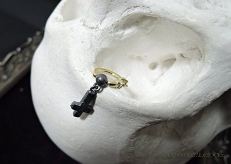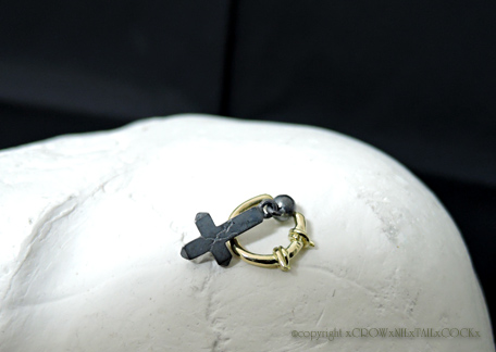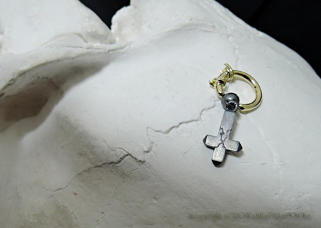 マテリアルについては、皮膚(ビアスホール)が接するリング部分にはより殺菌性の強いK18を、そして、チャームとなる逆十字とビーズ部分には全体に燻しを施したSilver925を使用。