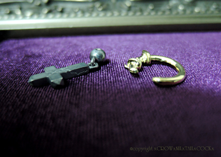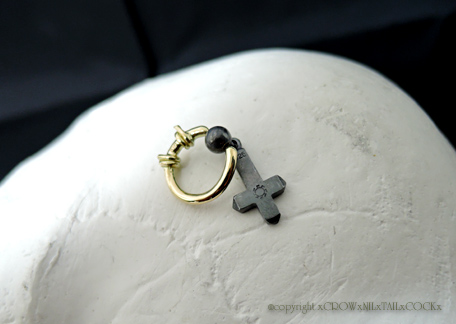有刺鉄線をイメージした二組の棘を有するリングパーツに、逆十字のチャームパーツを垂らしたキャプティブビーズリングタイプのピアス。