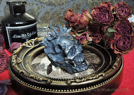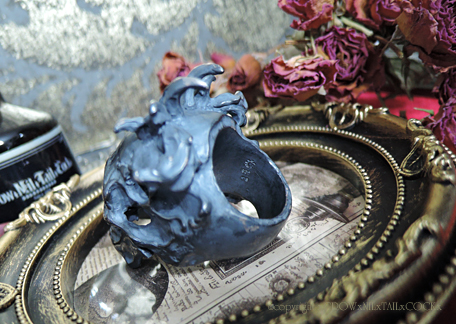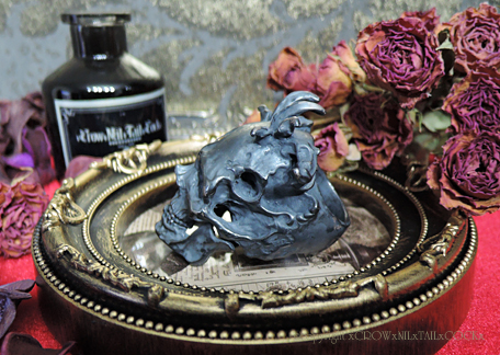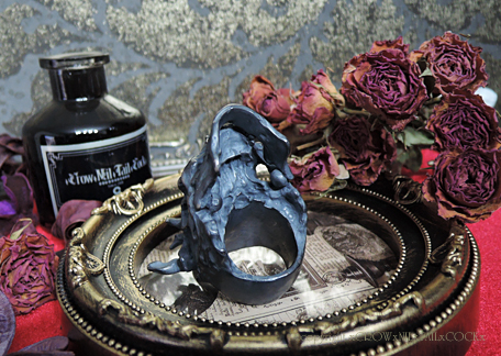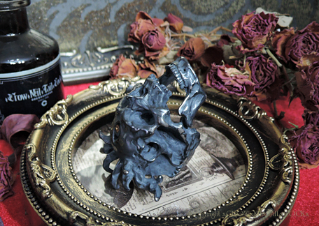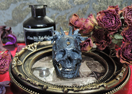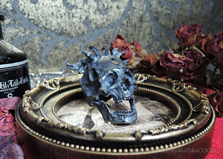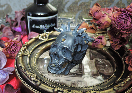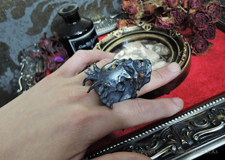 超重量級の頭蓋骨に山羊の頭骨を融合させた下顎可動式のスカルリング精細に造形されたシルバー製(Silver925)のスカルの両側面に山羊の頭骨を融合させ、頭頂部には歪に放射する8本の角をあしらったスカルリング。 約173グラムという指輪としてはあるまじき総重量を誇っており、額に埋め込まれた18金製のサードアイや造形全体の有機的な不気味さも相まって、人智を超えた悪魔的な呪物のようにも捉えられる作品となっている。 また、下顎にギミックを施すことによって開口可能な仕様となっており、単に着用したり鑑賞するだけでは得られない欲求を充足させることができる。 |